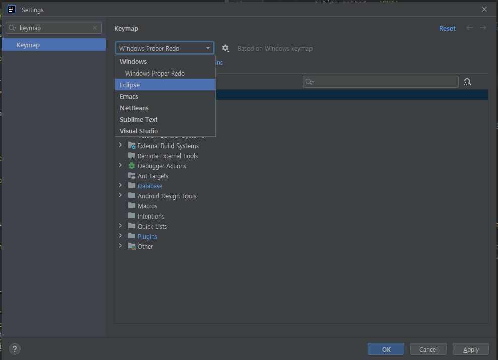 Windows Proper Redo로 나타나 있는 부분을 Eclipse또는 VisualStudio로 변경하시면 됩니다.